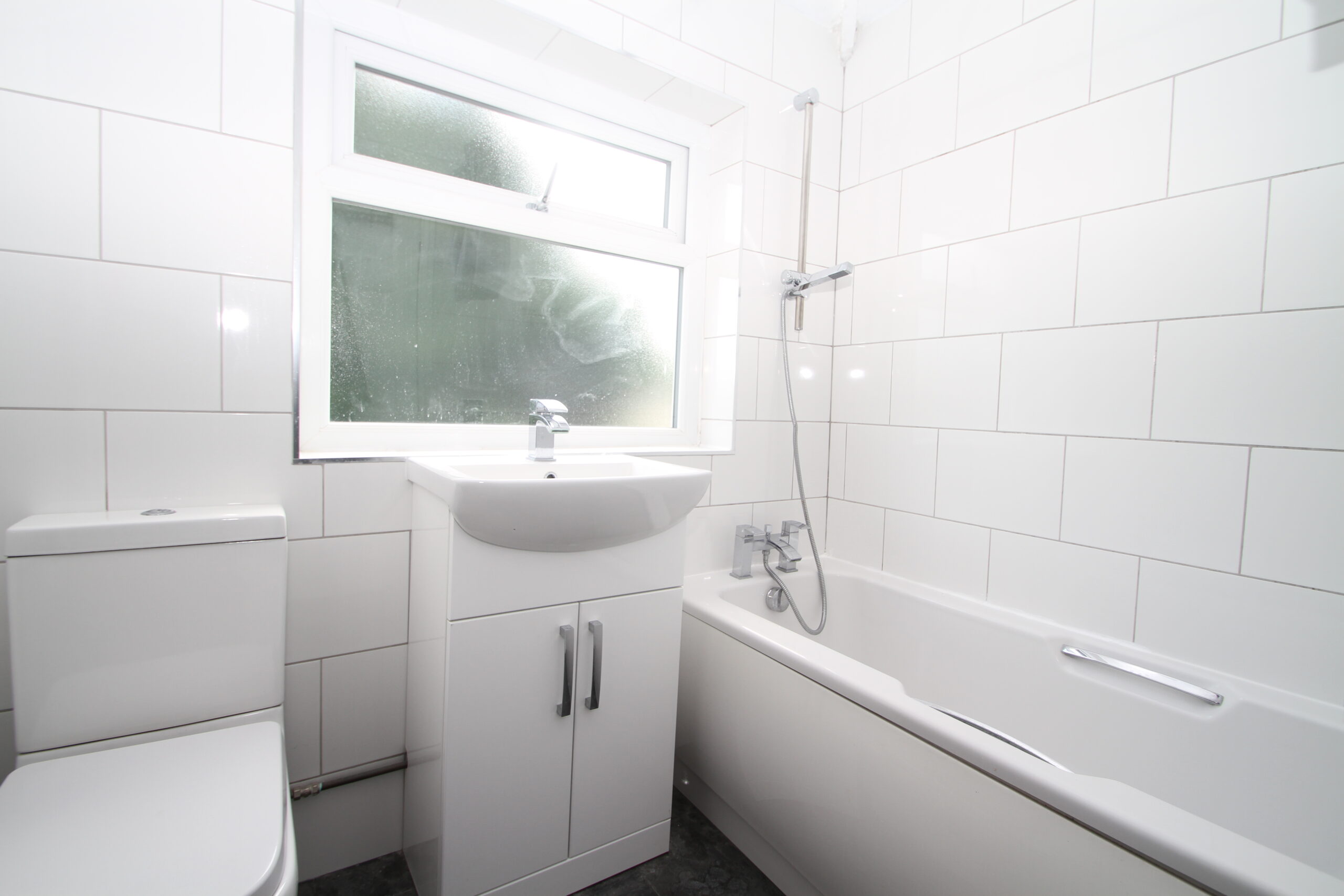 Vinyl flooring, fully tiled walls, enclosed lighting to ceiling, chrome heated towel rail, extractor fan to wall and double-glazed window with obscured glass to rear elevation. Suite comprises of:- Modern panelled bath with shower tap attachment and shower curtain and rail above, modern low-level flushing toilet and single bowl wash basin with mixer tap and vanity unit below.