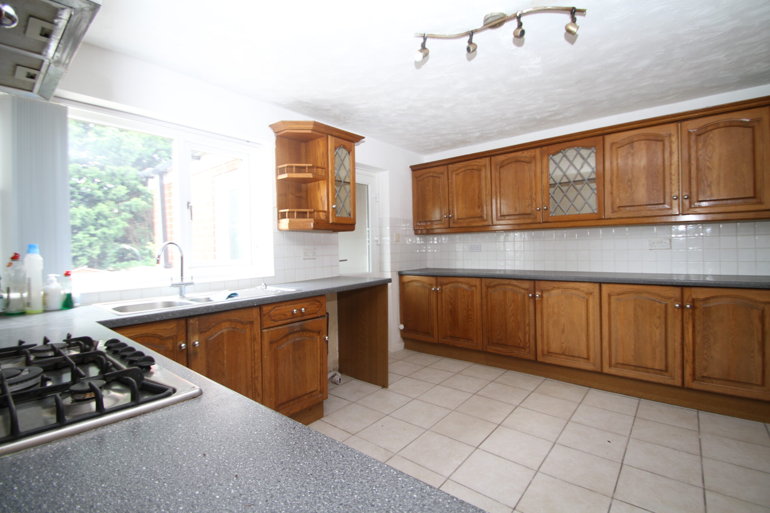 Fully tiled flooring, single panel radiator, two ‘track styled’ sets of spotlights to ceiling, Worcester Bosch central heating boiler to wall and double-glazed window to rear elevation. Kitchen comprises of:- Range of kitchen base and wall units with work surfaces, partly tiled walls as splashback, one and half sink, drainer and mixer tap. Fan assisted electric oven with five burner gas hob and chimney-styled extractor hood above. Space and plumbing provided for washing machine. Panelled door towards front, leads into:-