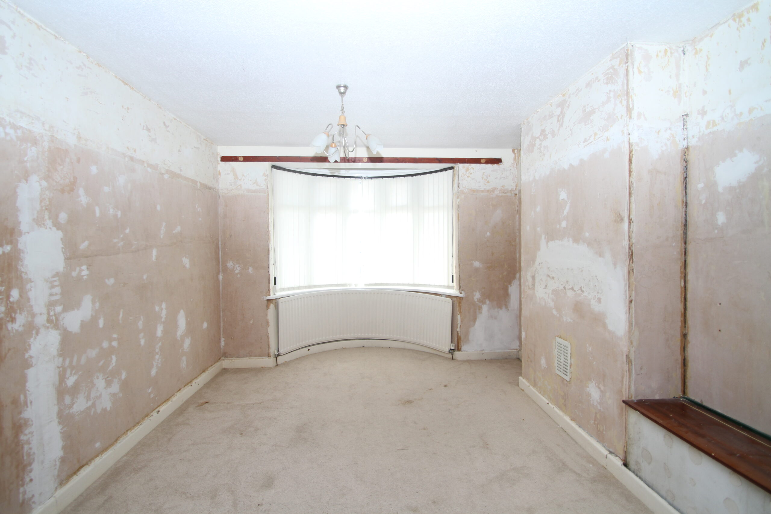 Carpeted flooring, two pendant light fittings to ceiling, wall mounted gas fire and single panel radiator towards rear, double glazed bay window to front elevation with curved single panel radiator beneath and double-glazed sliding door to rear leads into dining area (used as room divider). From hallway, panelled door to rear leads into:-