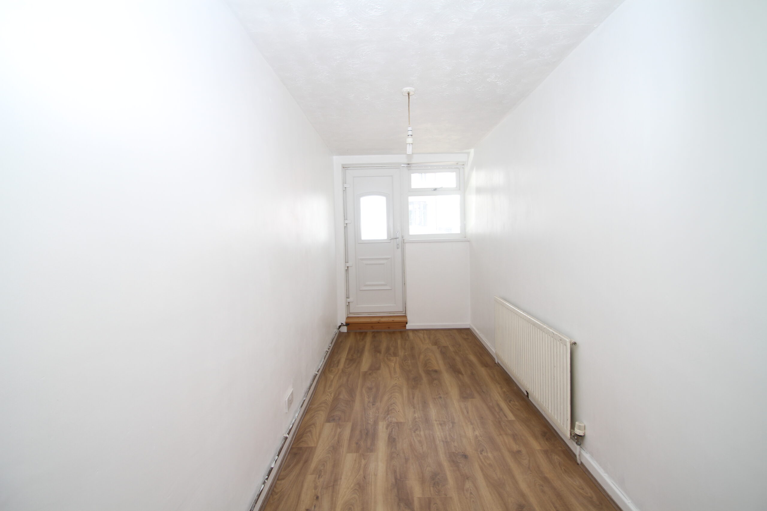 Laminate flooring, pendant light fitting to ceiling, single panel radiator, smoke alarm to wall and built-in cupboard housing gas meter. Concertina door to side leads into Under Stairs Cupboard with laminate flooring, light fitting and shelving to wall, single glazed window with obscured glass to side, wall mounted fuse board and electric meter. From hallway, panelled door to side leads into:-
